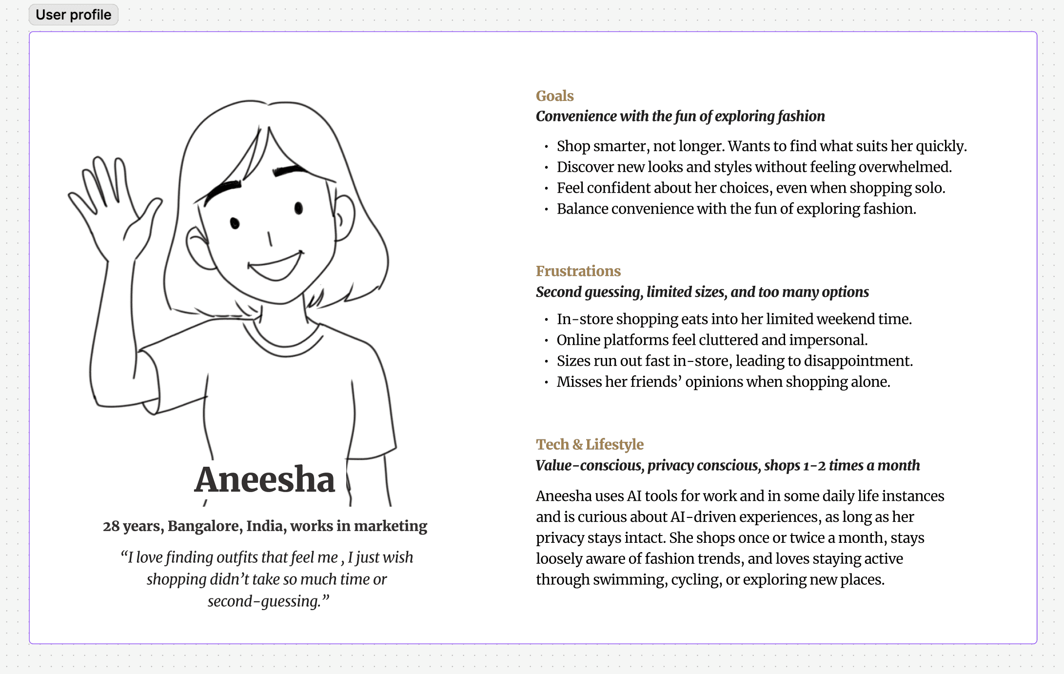 To better understand a customer’s perspective, meet Aneesha — the persona I created based on insights from a survey group of women aged 23 to 30.